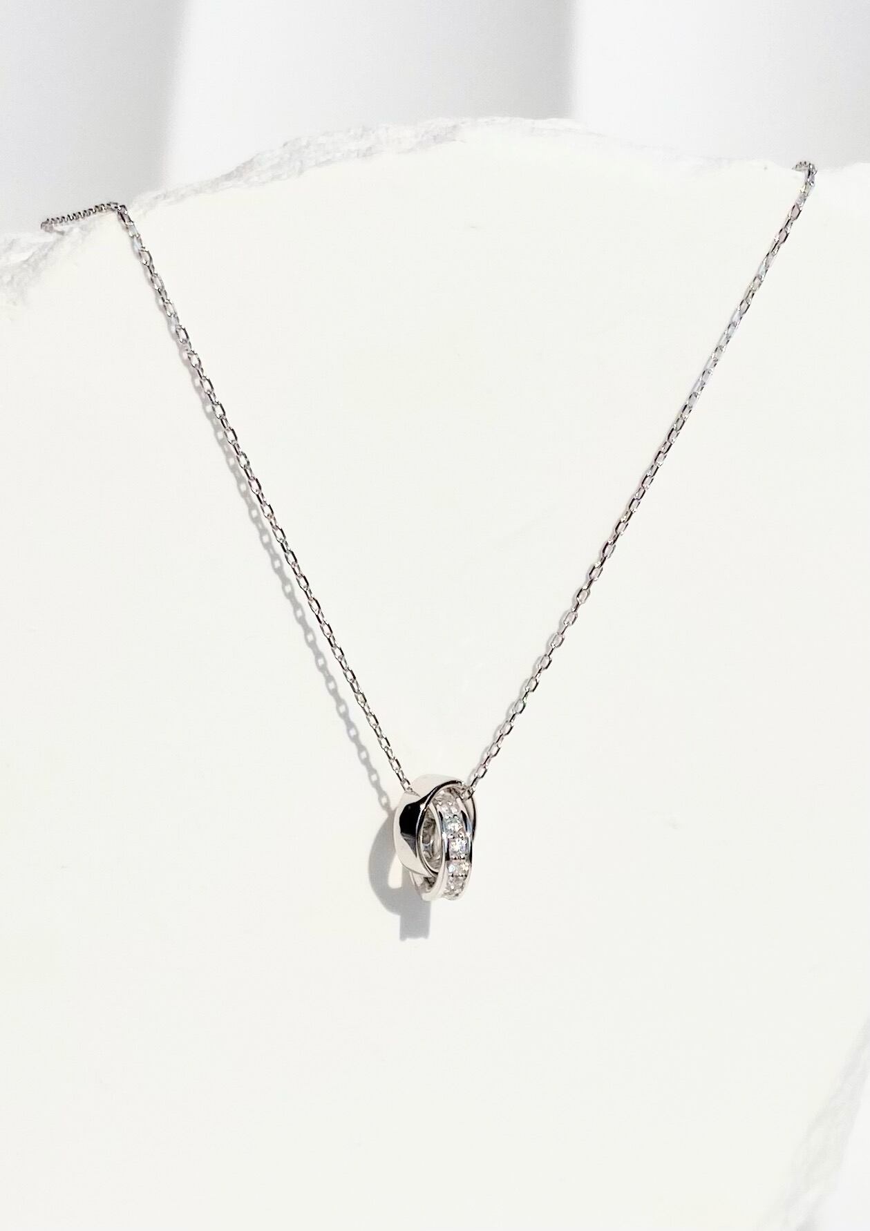 ダイヤモンドが途切れなく配されたリングとプレーンなリングを繋げることで「絆」や「繋がり」を表現したチャームネックレスです。