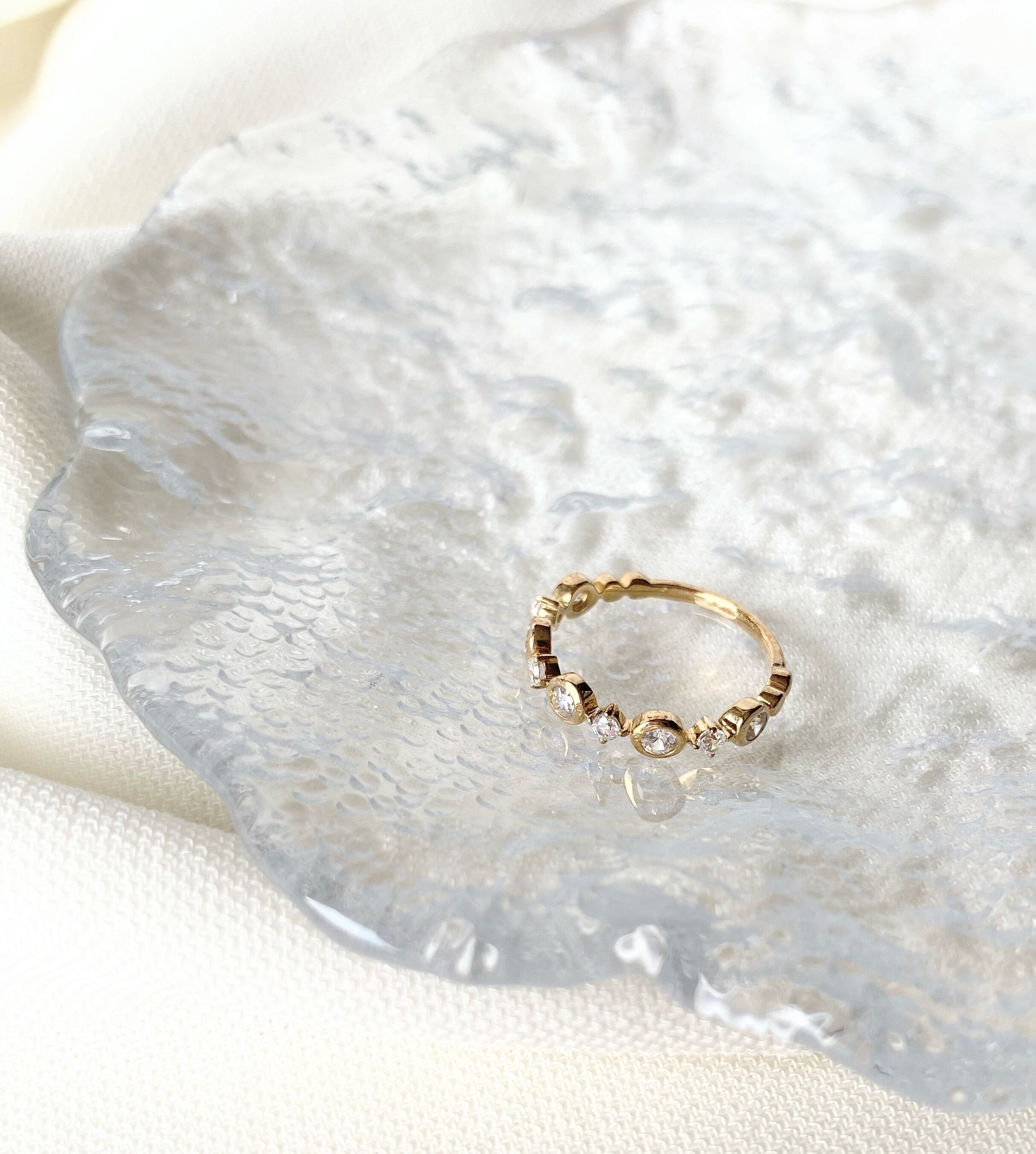 2サイズのブライダルクオリティダイヤモンドを横一列に交互に配置することで「人生の幸転機」を表現したリングです。