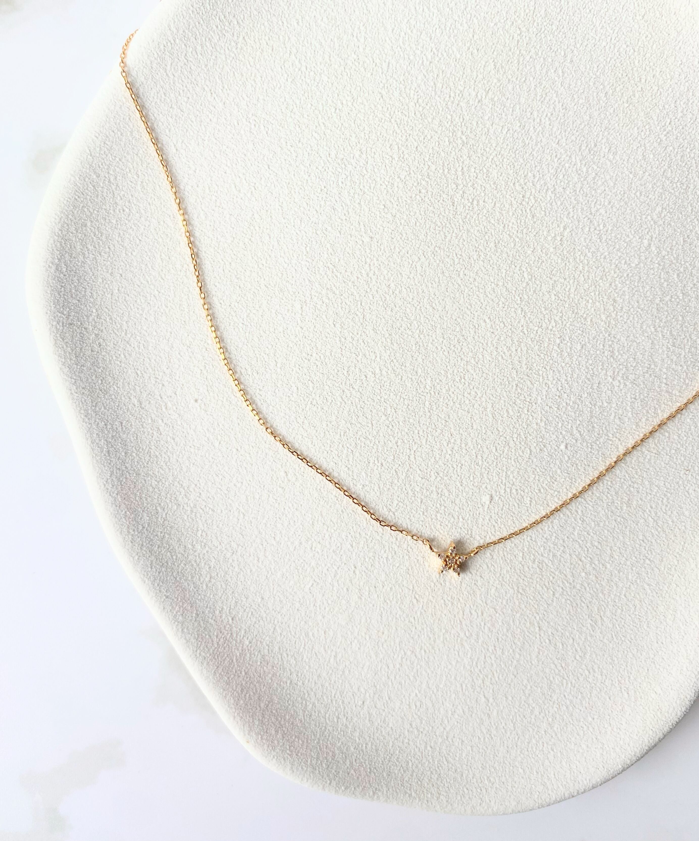 VSクラスの上質なダイヤモンドを極小サイズのスターデザインに6石配した小さくても力強く輝くベビーサイズのダイヤモンドスターネックレス。