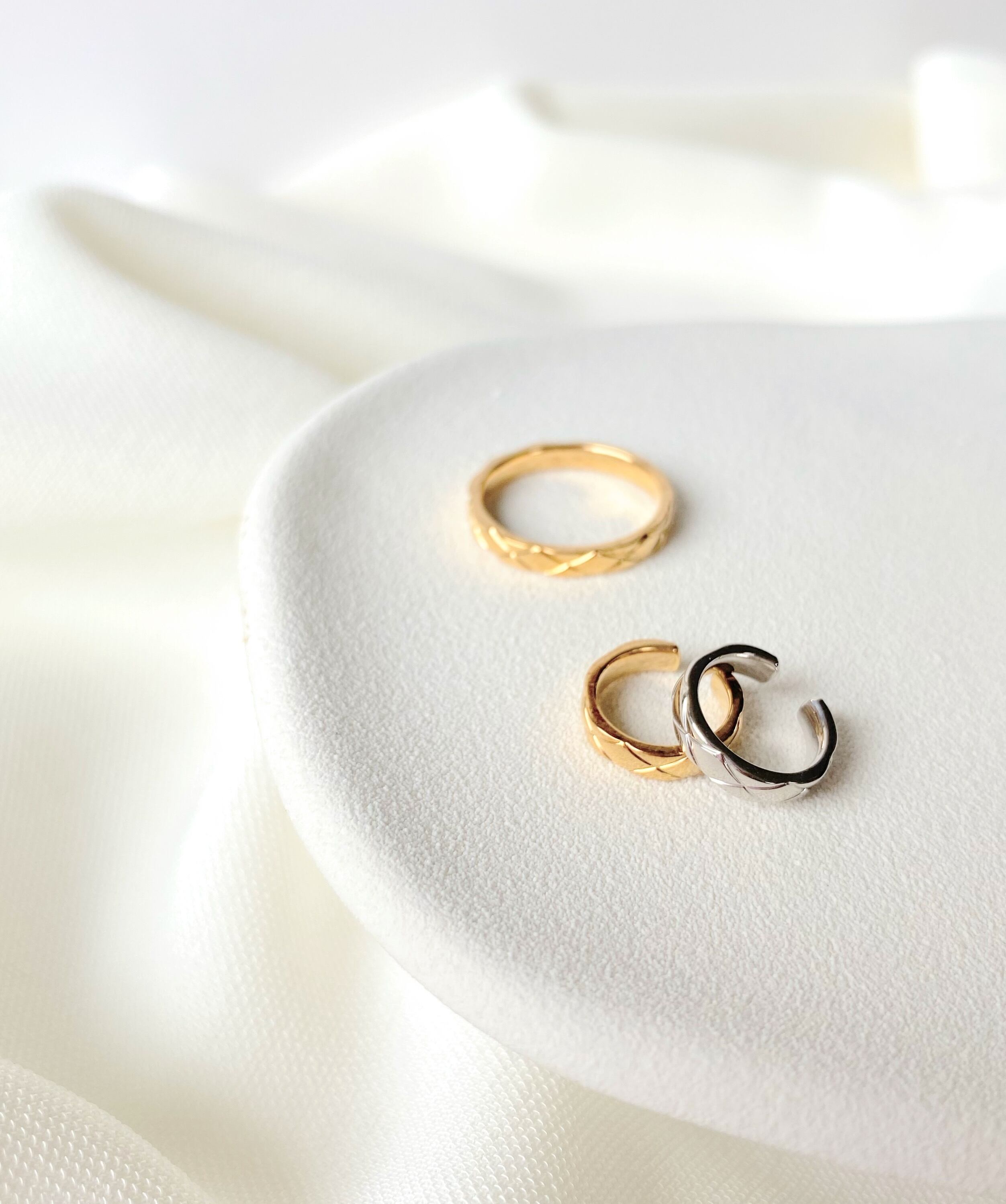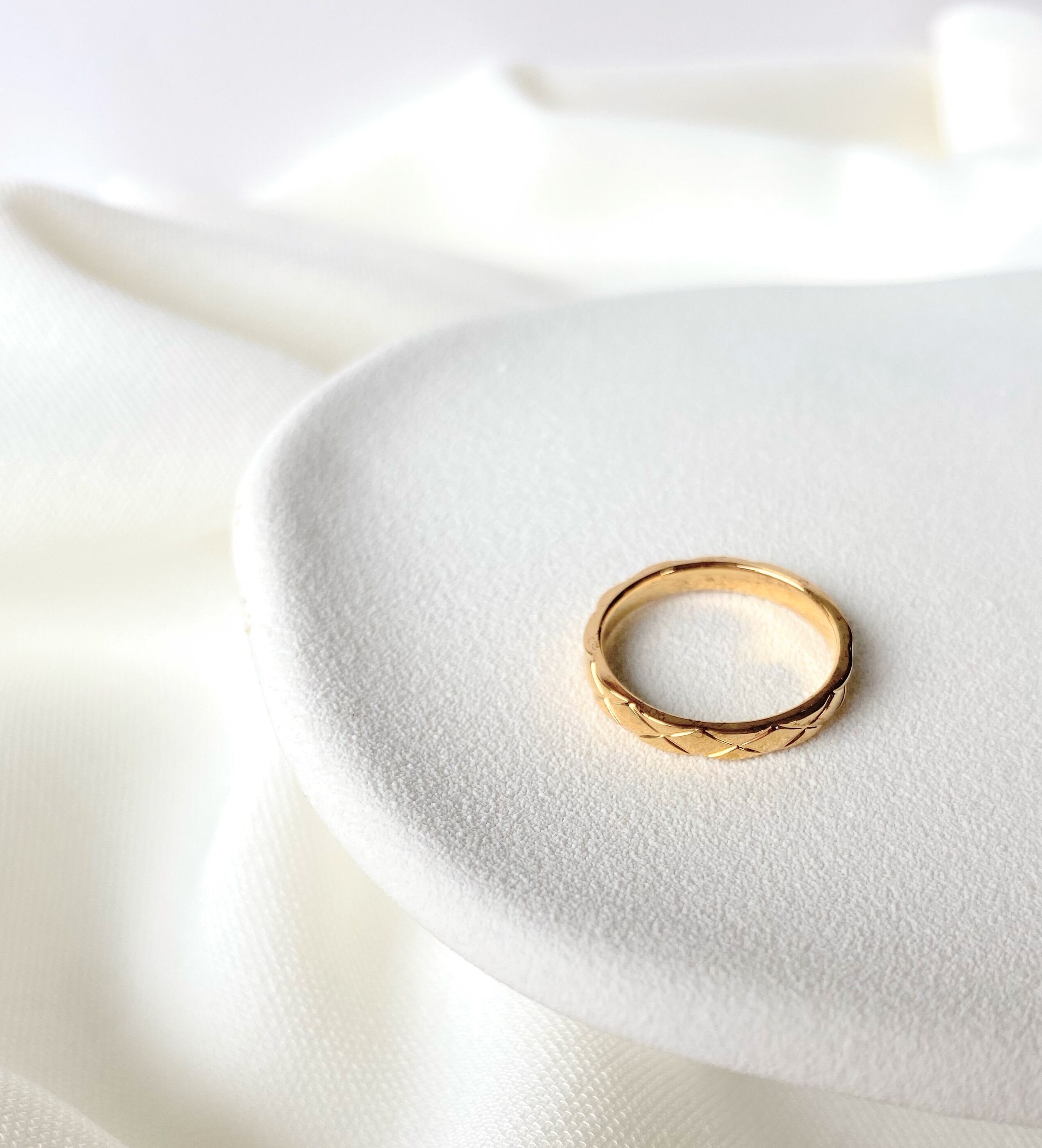 柔らかなクロス掛けキルト柄をモチーフに、シンプルなストレートラインに切り出されたリングです。