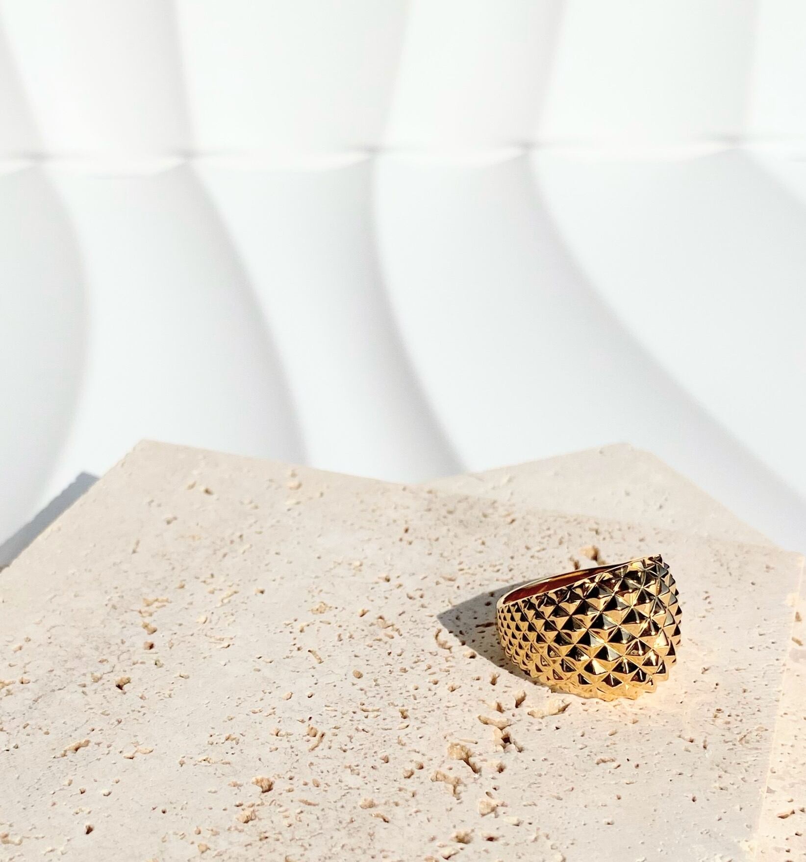 連鎖するピラミッドスタッズをグラデーションに配したモード感溢れるワイドリング。