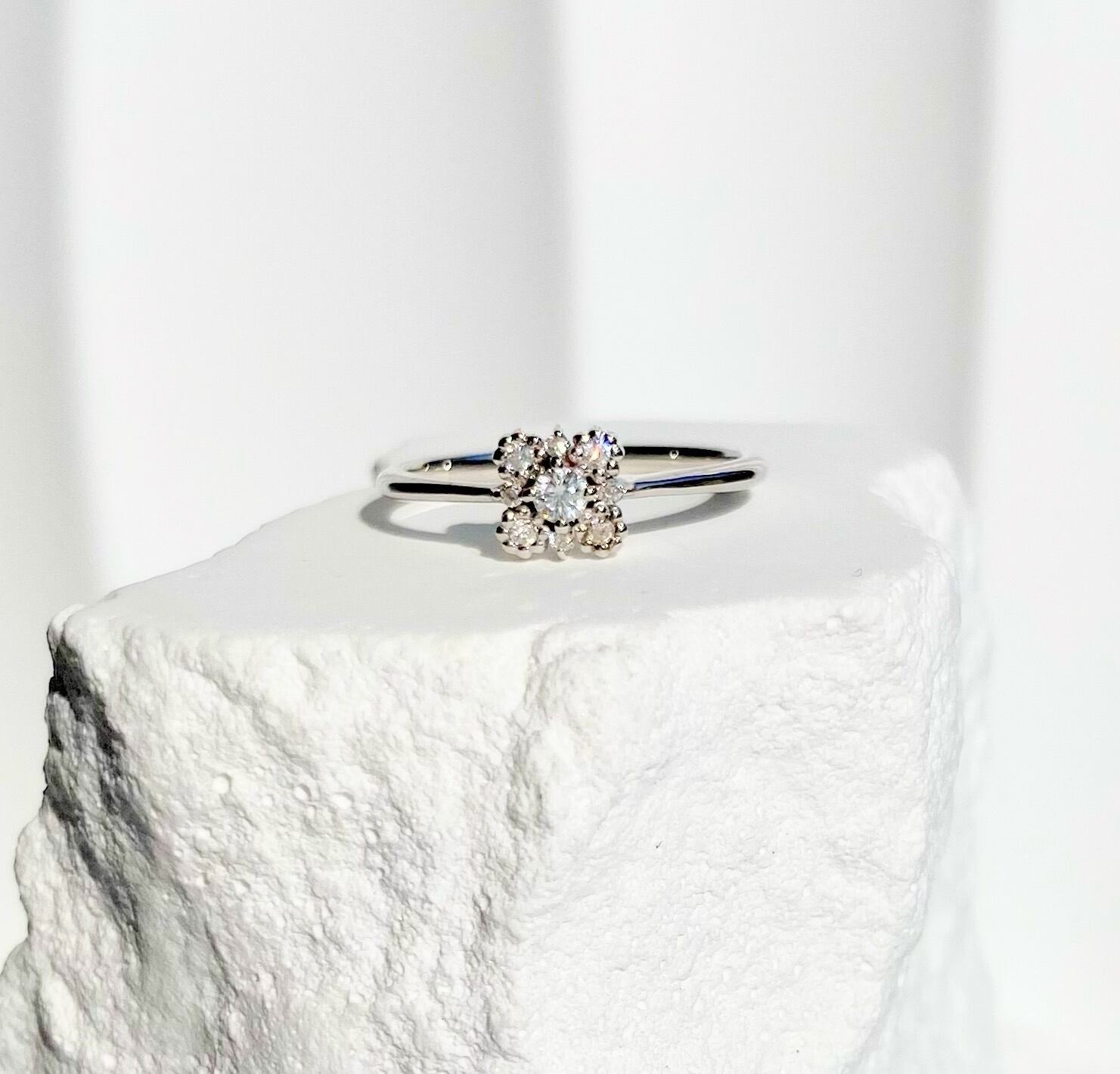 実りとバランスを意味する大小の正十字クロスデザインを重ねる事でボックス形にまとめられたダイヤモンドリング。